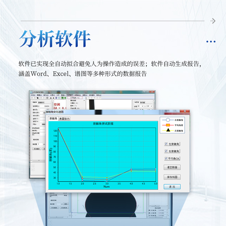 分析软件功能强大,具备一键式全自动拟合能力,具备拟合方法,满足各种液滴形态的精确拟合;